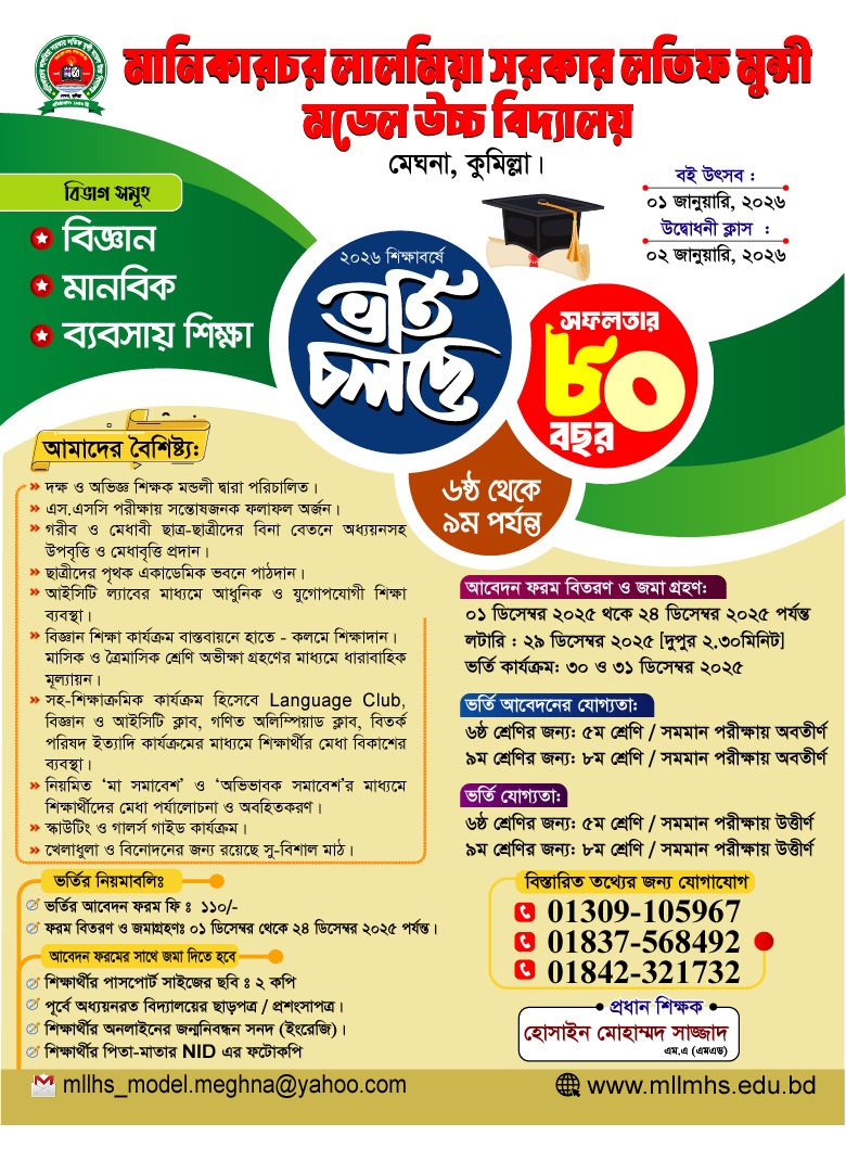 স্বাগতম >> মানিকারচর লালমিয়া সরকার লতিফ মুন্সী মডেল উচ্চ বিদ্যালয়, মেঘনা, কুমিল্লা ## এসএসসি (ভোকেশনাল) নবম শ্রেণিতে ভর্তি বিজ্ঞপ্তি প্রকাশ > আগামী ১৭/১১/২০২৫ হতে ২৩/১২/২০২৫ পর্যন্ত ফরম বিতরণ ও গ্রহণ >>বিস্তারিত-নোটিশ বোর্ডে ## জুনিয়র বৃত্তি পরীক্ষা ২৮-৩১ ডিসেম্বর ২০২৫ পর্যন্ত চলবে ## ২০২৬ শিক্ষাবর্ষে ৬ষ্ঠ শ্রেণিতে ভর্তি চলছে >> বিস্তারিত-নোটিশ বোর্ডে ## ২০২৫ সনের বার্ষিক (৬ষ্ঠ-৯ম শ্রেণি) ও নির্বাচনী (১০ম শ্রেণি) পরীক্ষার ফল প্রকাশ ৩০ ডিসেম্বর ২০২৫খ্রি. ##